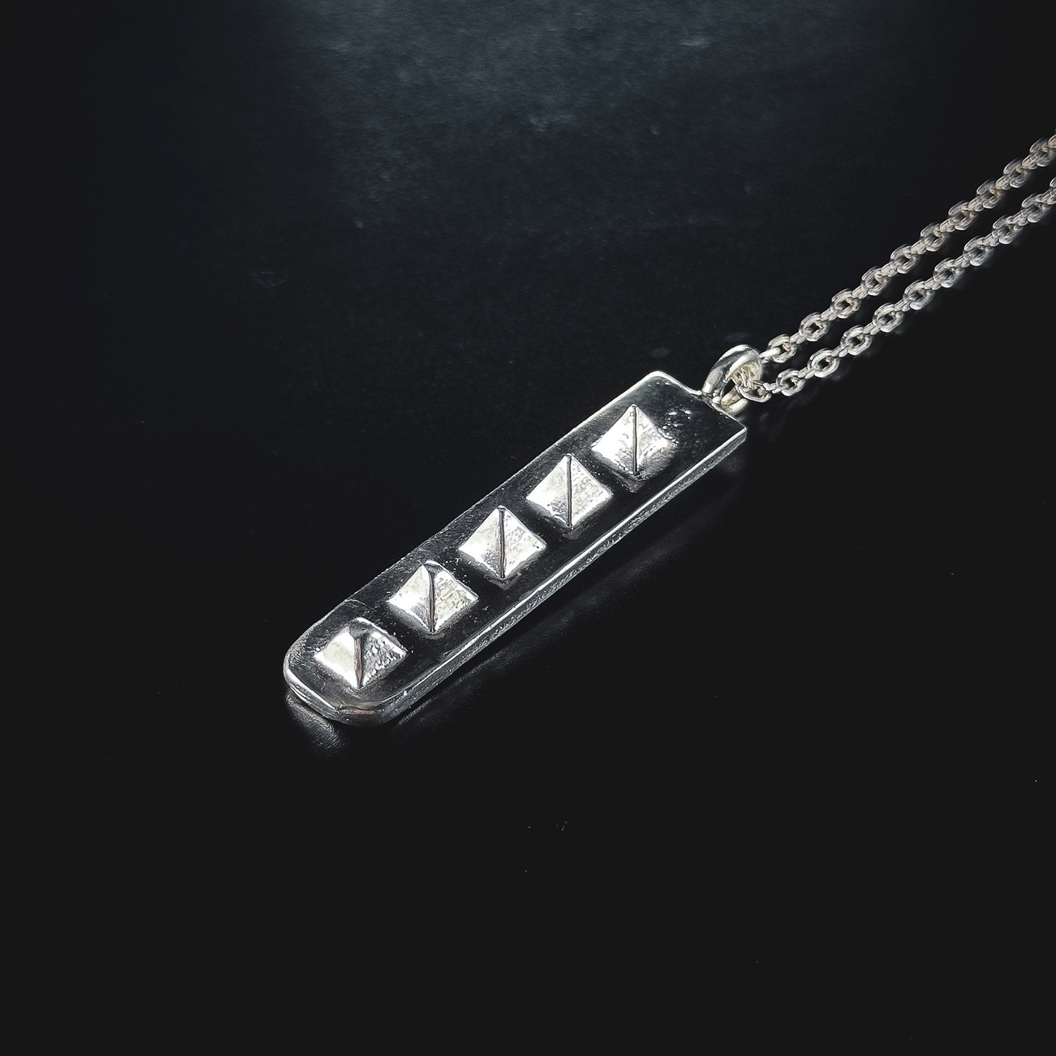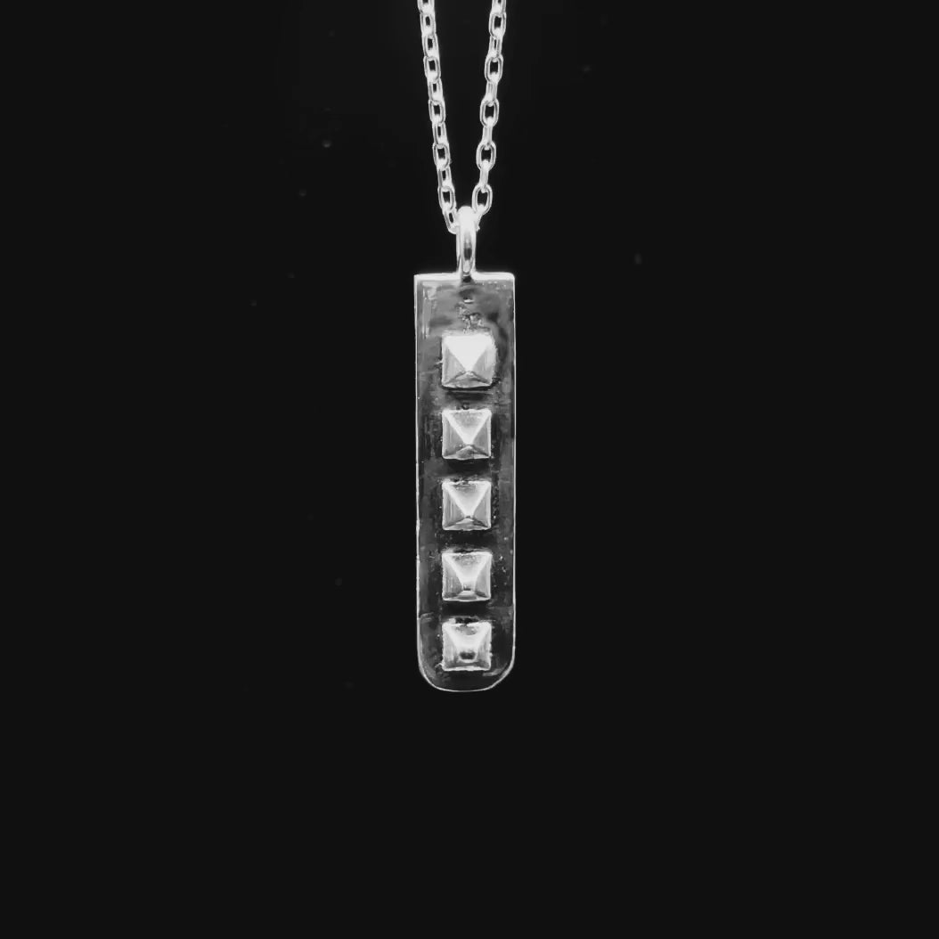 The Five Spike Pendant distils hostile architecture into a stark, horizontal form. A larger eroded slab with 5 spikes inspired by the metal deterrents found in public to prevent people from stopping, sitting or sleeping. This pendant was created as a protest against the punishment of hostile architecture.