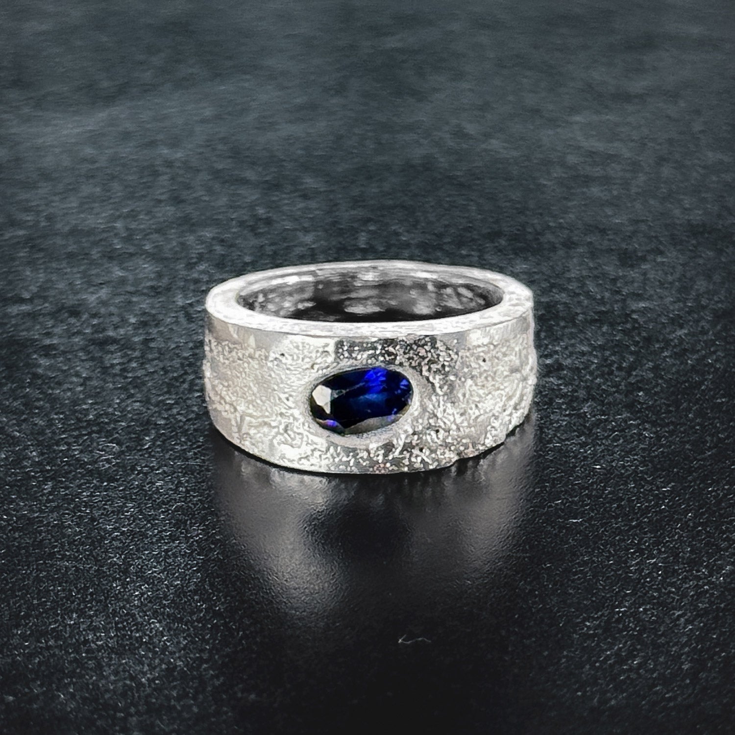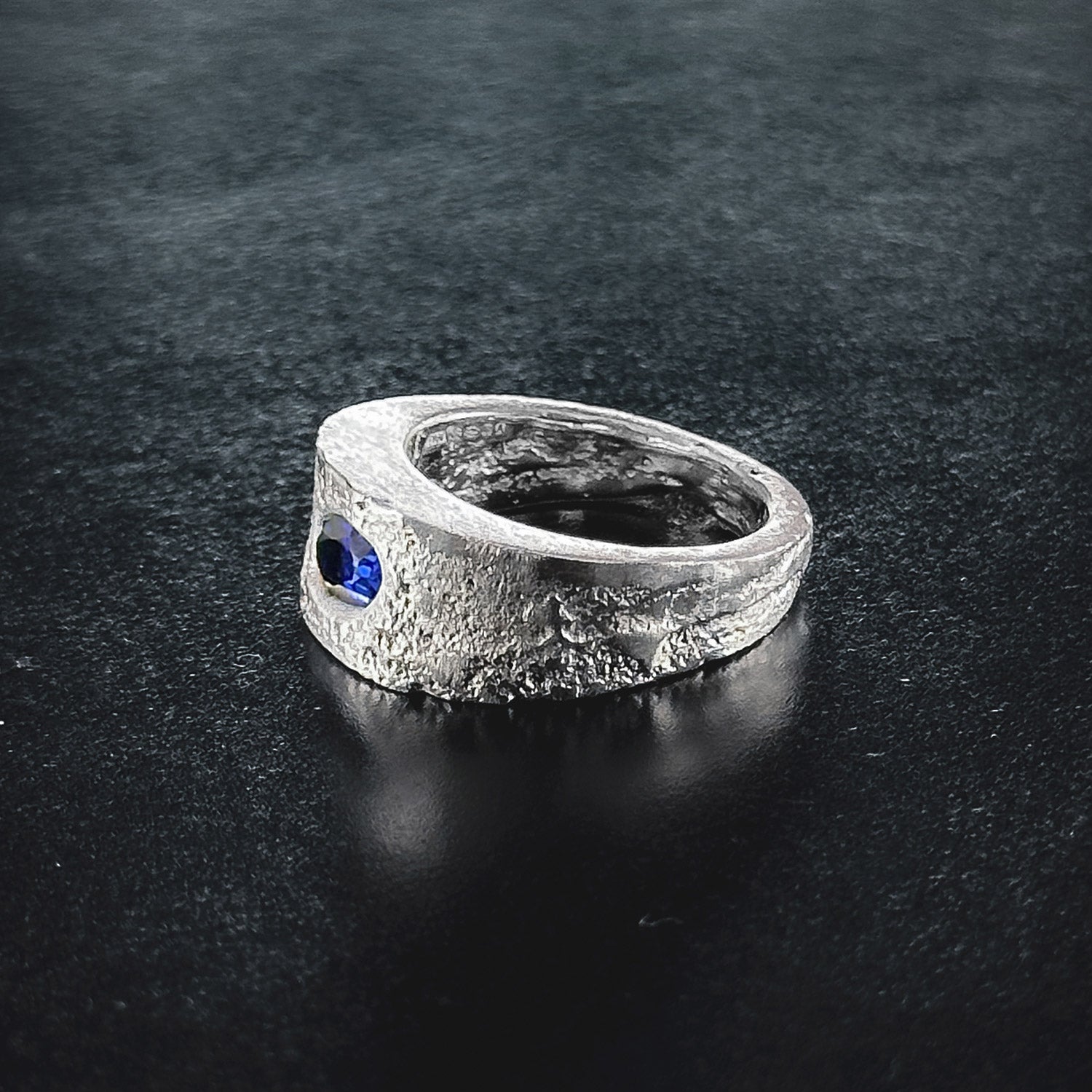 Every ring is custom made and unique, stones and form differs slightly, ensuring no two pieces are ever the same. In this example of the Fragment Band ring a single blue Sapphire was used.