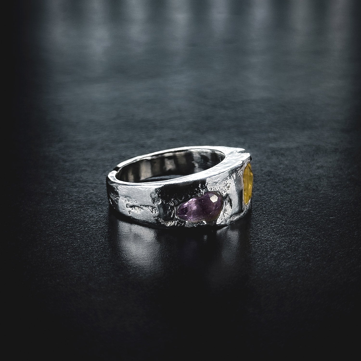 Every ring is custom made and unique, stones and form differs slightly, ensuring no two pieces are ever the same. In this example of the Fragment Band ring, amethyst and citrine stones were used.